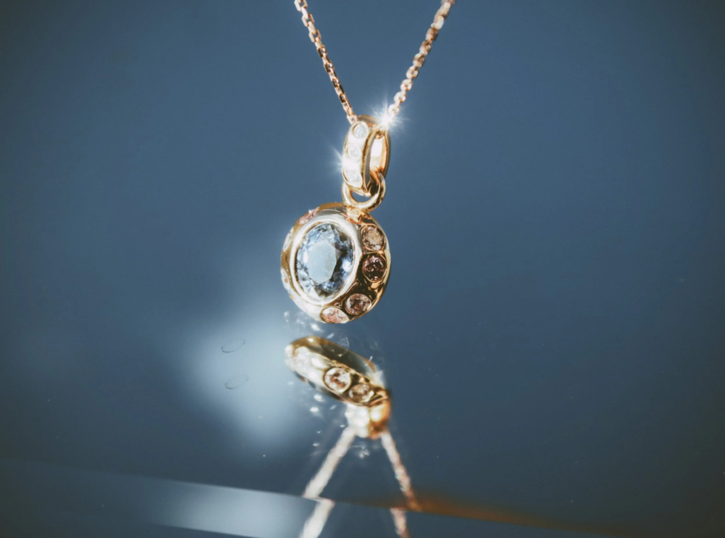 A celeste blue sapphire encased in solid 18k Rose Gold and pink diamonds hanging from a white diamond-encrusted beil. The casing is tapered at the back and evokes the profile of a spaceship. Rear window that signifies an entrance, a portal.
